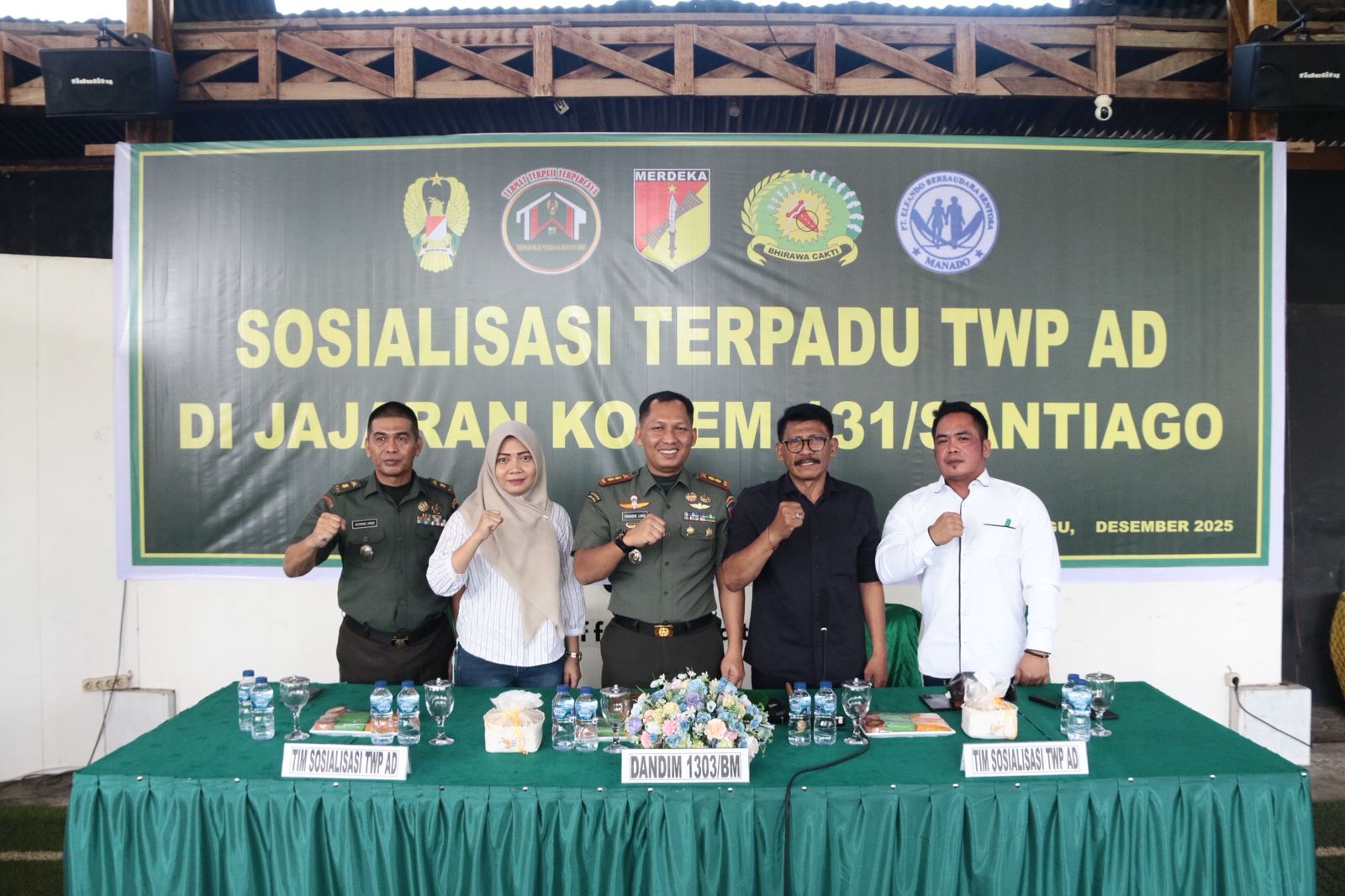 SULAWESI.NEWS, HUKRIM — Komando Distrik Militer (Kodim) 1303/Bolaang Mongondow menggelar kegiatan Sosialisasi Terpadu Tabungan Wajib Perumahan (TWP) TNI Angkatan Darat bagi prajurit jajaran Korem 131/Santiago yang bertugas di wilayah Bolaang Mongondow Raya, Senin (15/12/2025).