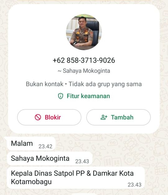 Kasat Pol PP Kota Kotamobagu mengimbau seluruh masyarakat untuk selalu berhati-hati dan tidak mudah percaya terhadap pesan mencurigakan. Tidak mudah percaya pada pesan dari nomor atau akun tidak dikenal, meskipun memakai nama atau foto pejabat Satpol PP.