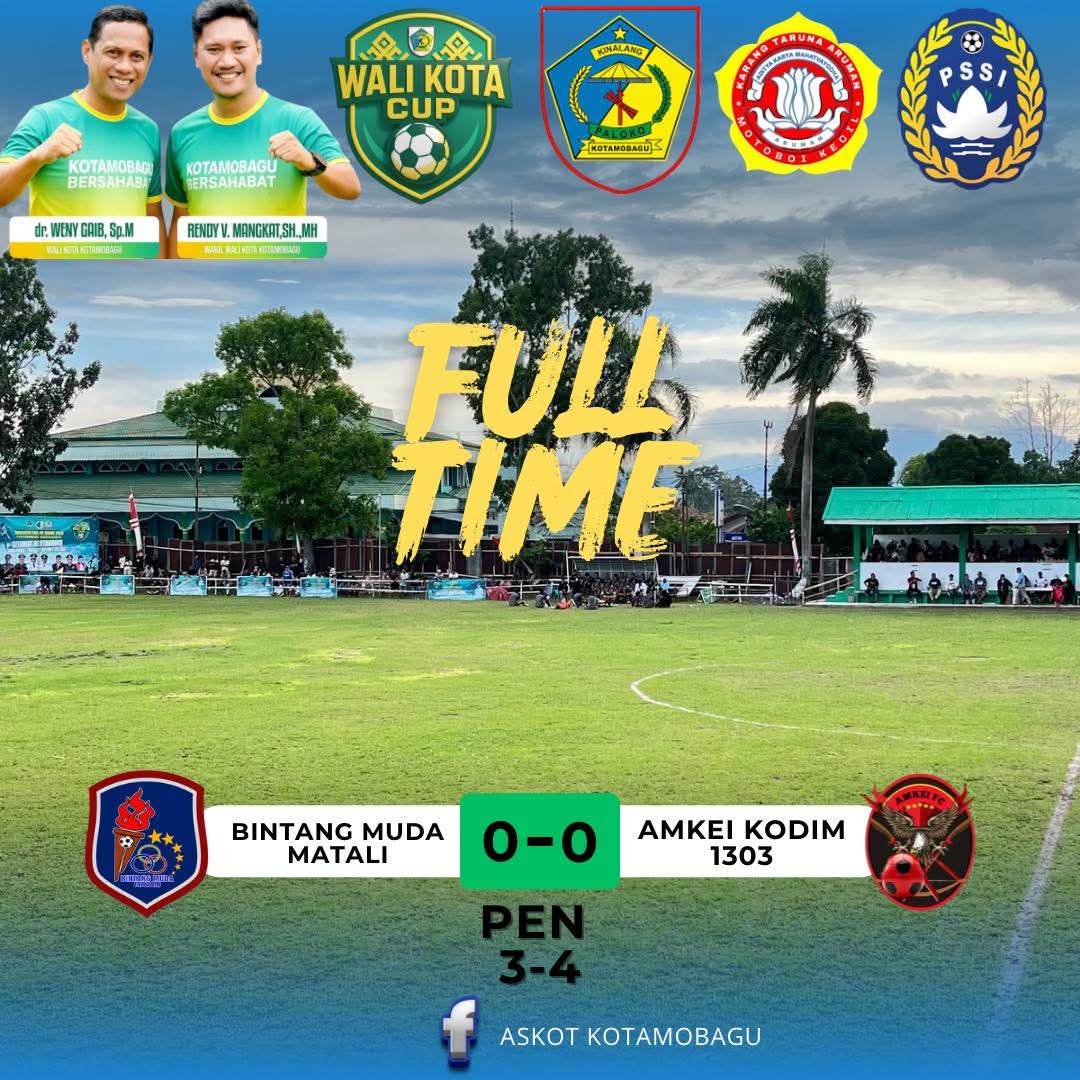 SULAWESI.NEWS, OLAHRAGA— Laga penuh tensi terjadi pada babak 12 besar Walikota Cup 2025, Sabtu (06/12/25), ketika AMKEI KODIM 1303 berhasil menyingkirkan Bintang Muda Matali melalui drama adu penalti yang menegangkan. Pertandingan yang berlangsung ketat sejak menit awal ini berakhir imbang di waktu normal, memaksa kedua tim menentukan nasib lewat titik putih.